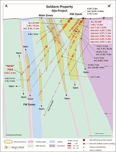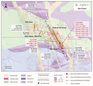 ALJ-25-029: This hole was drilled to test broad mineralization in the HW, Main and FW Zones up-dip of ALJ-23-004 that returned results of 0.95 g/t Au over 14.3 m (HW), 3.65 g/t Au over 6.3 m (Main Zone) and 13.35 g/t Au over 3.6 m (See press release dated February 15, 2024). ALJ-25-029 yielded similar results in the HW Zone returning 1.46 g/t Au over 14.3 m including 9.36 g/t Au over 1.0 m with visible gold in strongly altered and pillowed variolitic mafic volcanic and pillow breccias. The Main Zone yielded results up to 6.65 g/t Au over 0.7 m and 1.15 g/t Au over 9.0 m showing strong continuity to previous moderate and high-grade intercepts in surrounding drillholes. The FW3 Zone was intersected at step-outs of 60-75 m from previous drilling and showed good continuity of grade yielding peak intercepts of 1.15 g/t Au over 6.5 m and 4.13 g/t Au over 0.7 m in amygdaloidal mafic volcanic flows. FW4 was intersected 50 m downhole from FW3 yielding a peak result of 4.22 g/t Au over 1.5 m. Overall, the Footwall Zones appear to be moderately oblique to the HW and Main zones as they are focused along E-W oriented porphyry sills. They will be targeted at shallower depths in future drill campaigns.